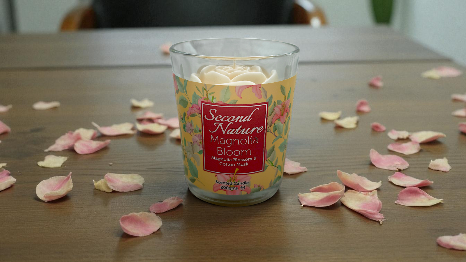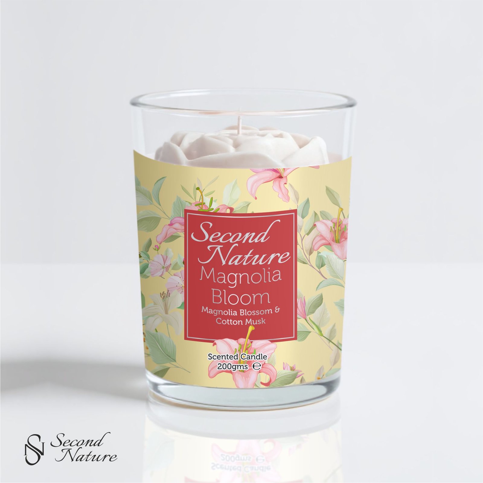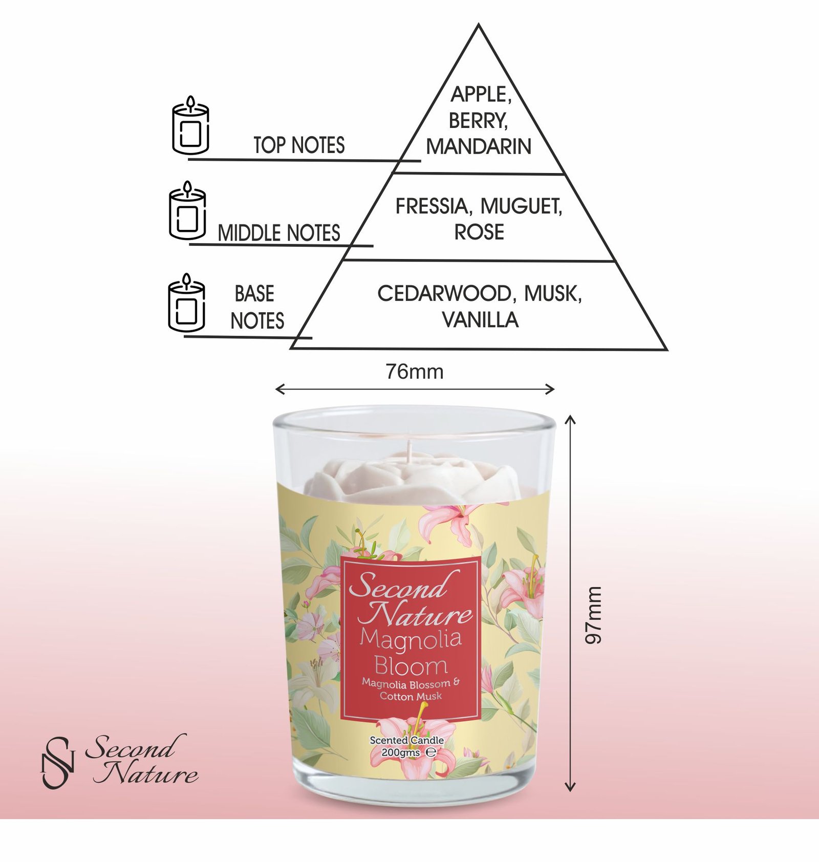The Magnolia Bloom Scented Candle opens with crisp apple and berries, flowing into soft freesia, lily-of-the-valley, and rose. As the flame glows, cedarwood, musk, and vanilla create a grounding, creamy finish.